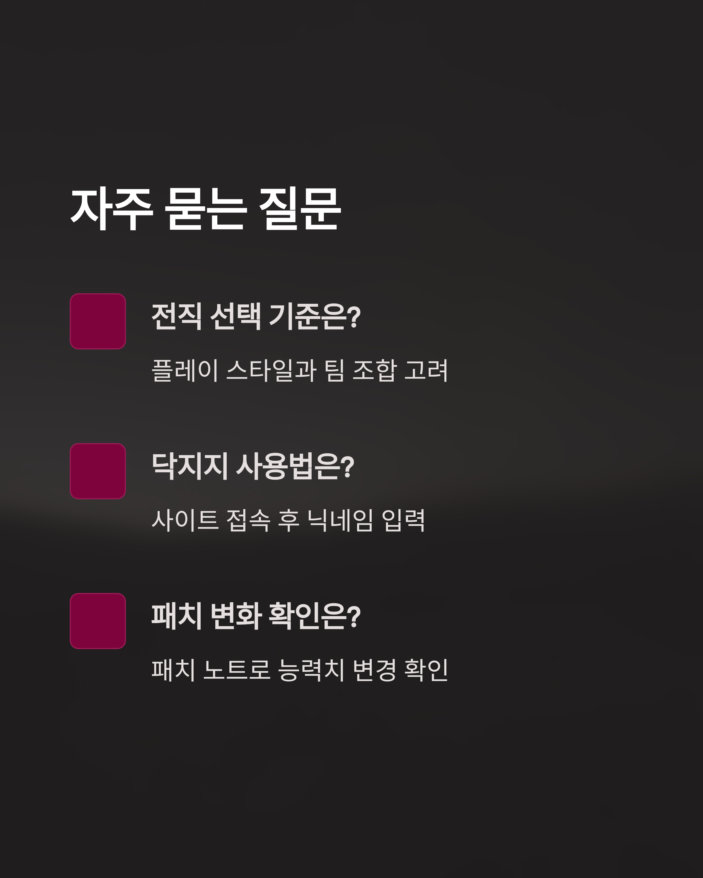 - 닥지지 전적검색은 어떻게 사용하나요? - 닥지지 사이트에 접속하여 플레이어의 닉네임을 입력하면 전적을 확인할 수 있습니다.