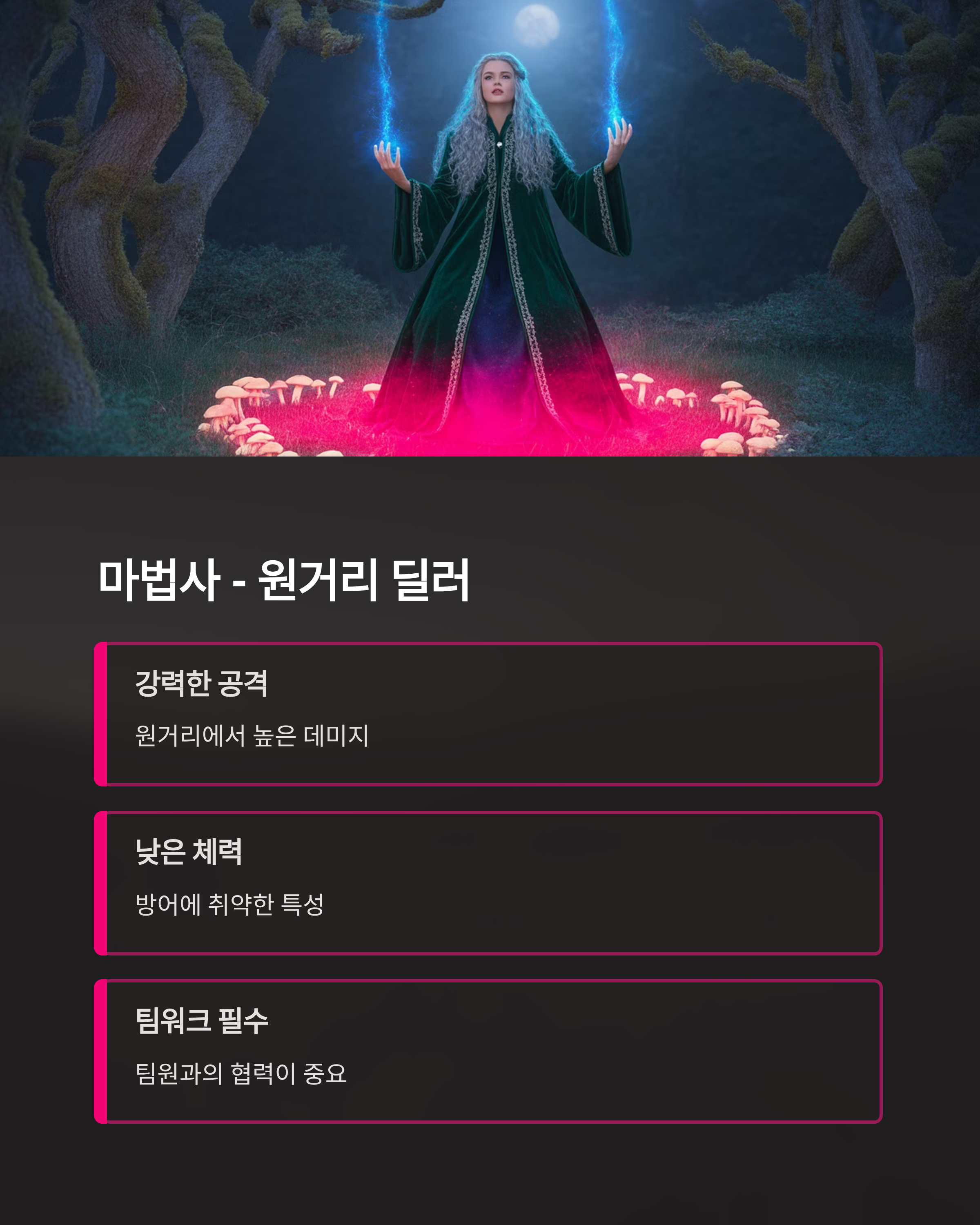 | 마법사 | 강력한 원거리 공격 | 팀원과 협력 |