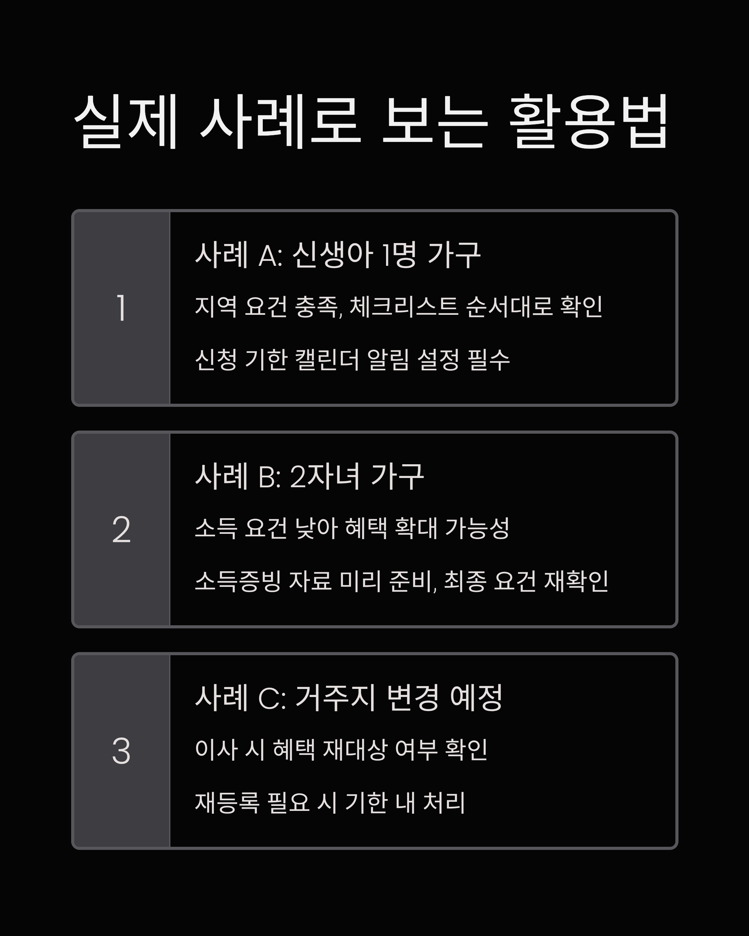 - 사례 B: 2자녀 가구인데 가구 소득 요건이 다소 낮아 혜택이 확대될 수 있는 경우. 소득증빙 자료를 미리 준비하고, 신청 전 지역 공지로 최종 요건을 재확인합니다.