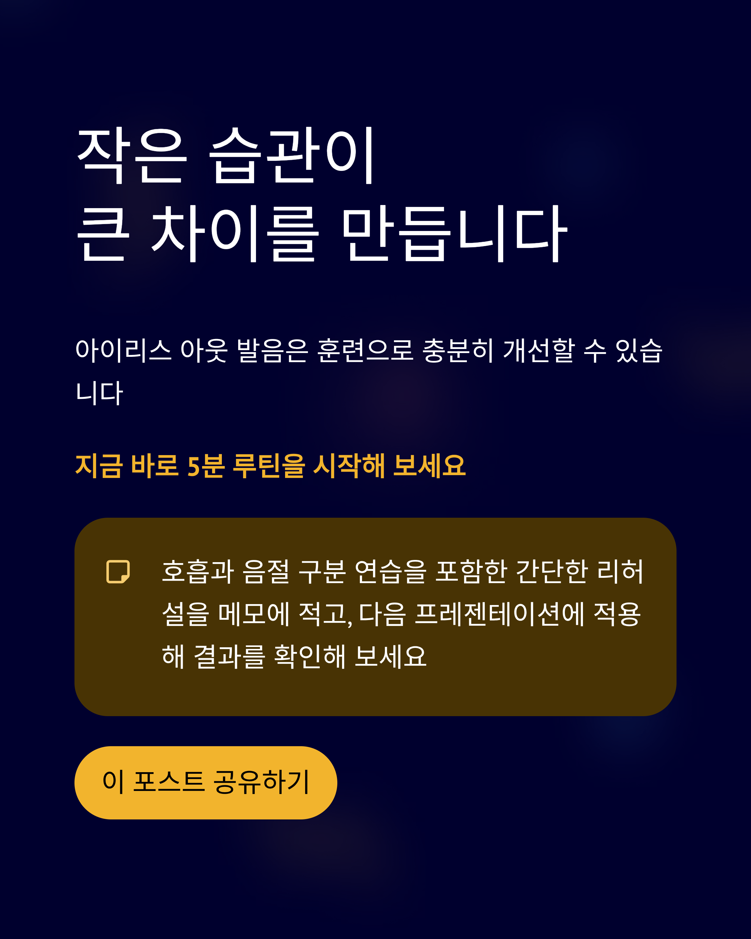 아이리스 아웃 발음은 훈련으로 충분히 개선할 수 있습니다. 작은 습관의 변화가 발표의 전달력과 신뢰도에 큰 차이를 만듭니다. 지금 바로 5분 루틴을 시작해 보세요.