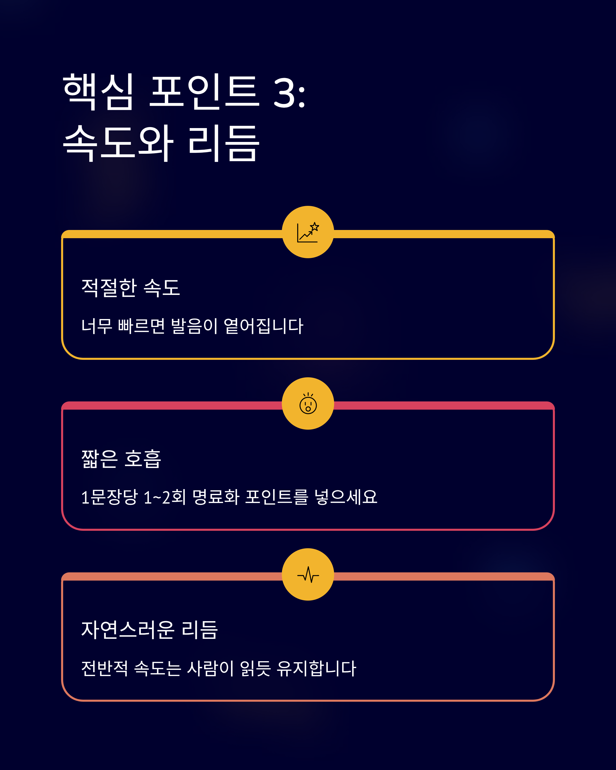 - 포인트마다 짧은 호흡을 넣어 청중의 이해를 돕고 청신호를 만든다.