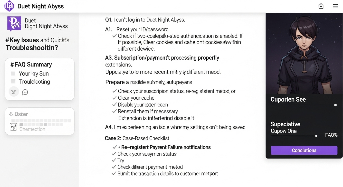 듀엣나이트 어비스의 자주 묻는 질문은 빠른 해결의 열쇠를 제공합니다. 본 가이드를 따라하면 대부분의 이슈를 몇 분 안에 해결하거나 원인을 명확히 파악할 수 있습니다. 추가로 해결되지 않는 문제가 있다면 댓글로 남겨 주시거나, 최신 이슈를 받아보려면 구독을 고려해 보세요. 문제를 정확히 공유하면 더 맞춤형 해결법을 제공해 드리겠습니다.