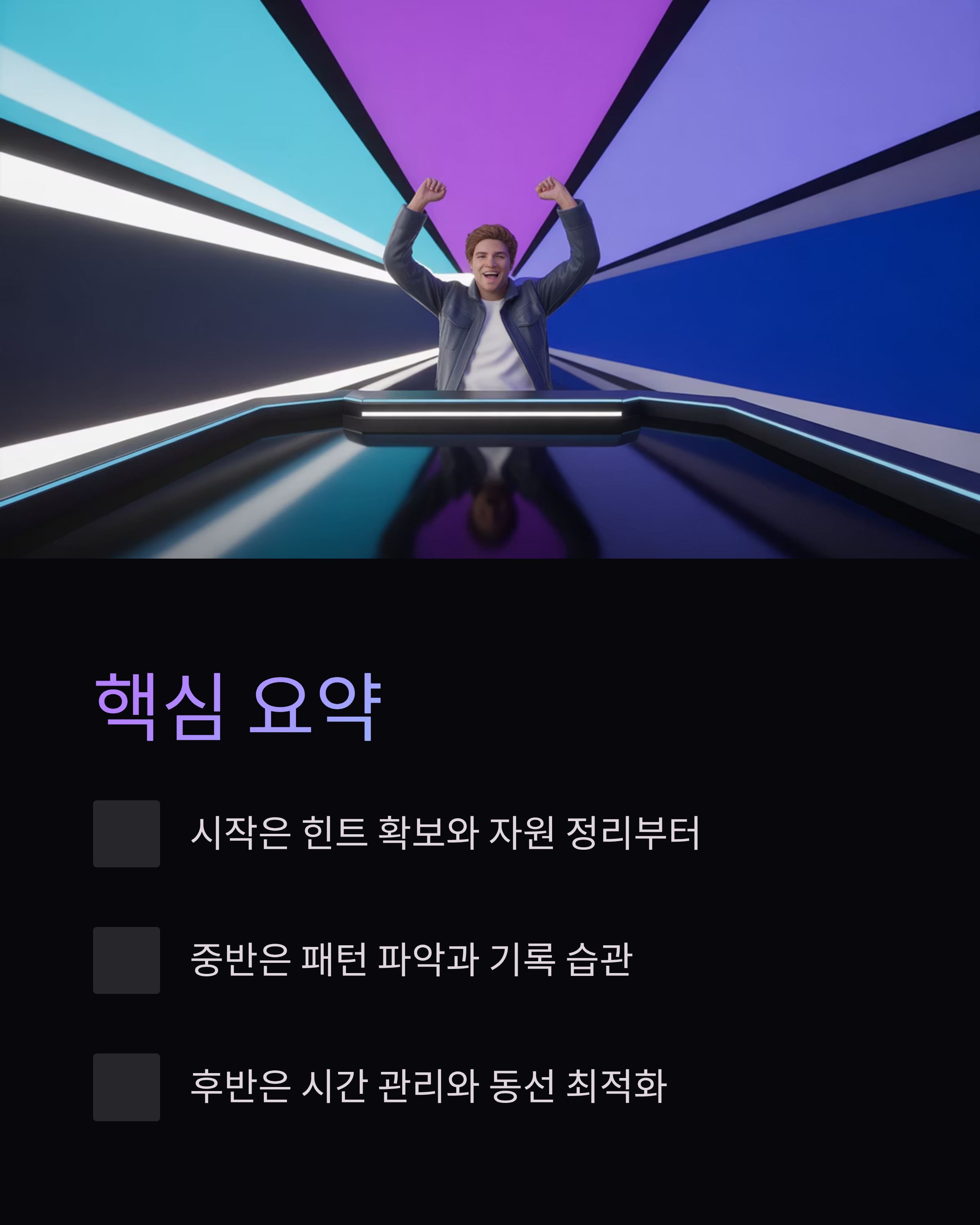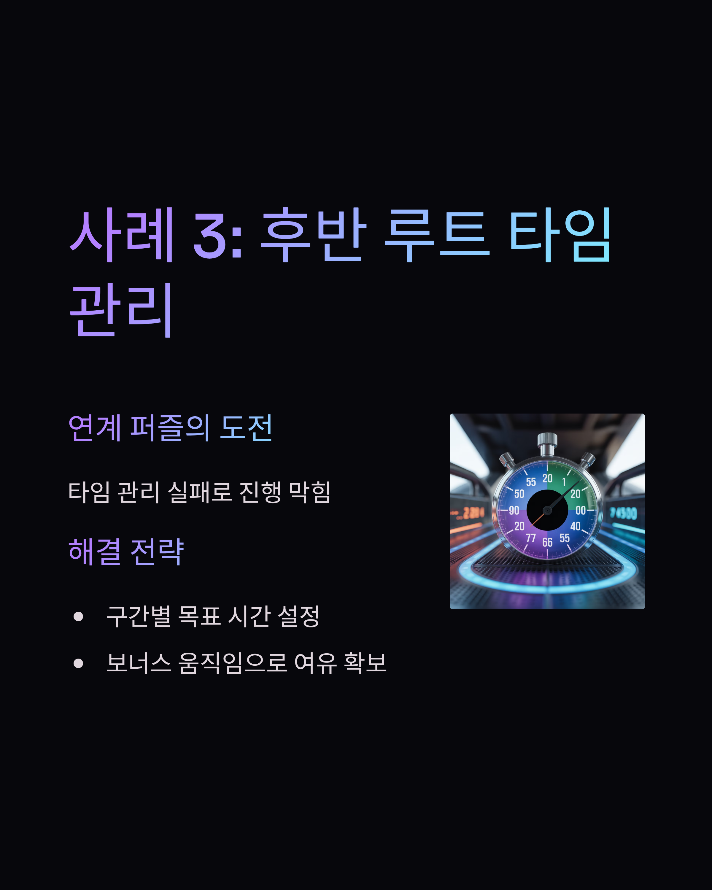 - 사례 3: 후반 루트에서 연계 퍼즐의 타임 관리 실패. 해결법은 구간별 목표 시간을 정하고, 남는 시간은 미리 남겨둔 보너스 움직임으로 커버하는 것.